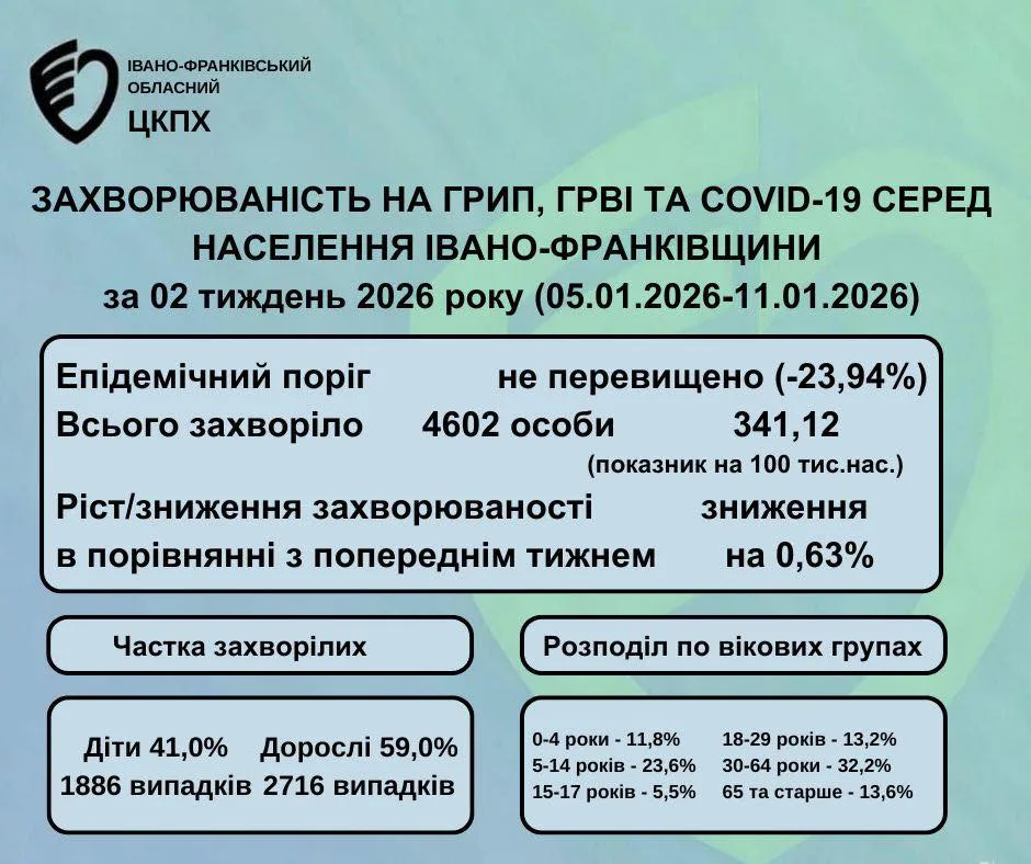 Упродовж другого тижня 2026 року в Івано-Франківській області зафіксували зниження рівня захворюваності на грип, ГРВІ та COVID-19 на 0,63%.